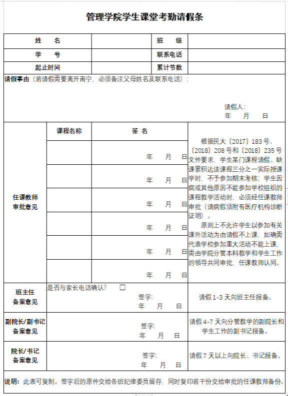 第三条 请假统一使用由公司指定的模板《管理公司员工课堂教学请假条》。